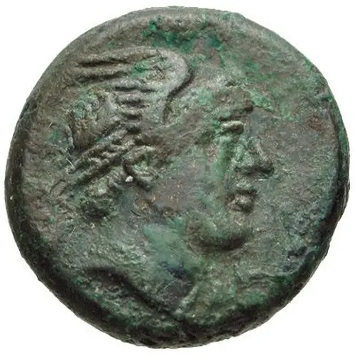 | توضیحات روی سکه | Head of Hermes right, wearing winged diadem; thyrsos behind. |