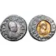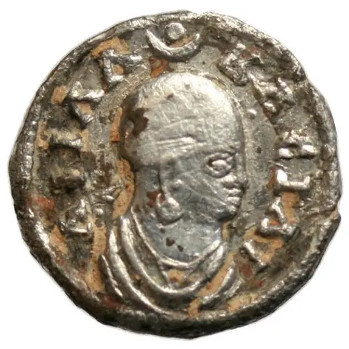 | Description du revers | Small bust of Aphilas to right, wearing headcloth ornamented on front and ending with triangular ribbon behind, within a hollow gilt circle; above, pellet on crescent dividing lettering. Border of dots. |