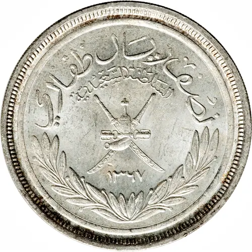 | نوشتههای روی سکه | نصف ريَال ظفاري السَّلطَنَة السَّعيديّة ١٣٦٧ (Translation: Half Dhofari Rial Sa`idian Sultanate 1367) |
