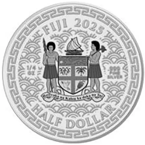 | Legenda del dritto | FIJI 2025 1/4 oz .999 FINE SILVER Rerevaka na Kalou ka doka na Tui HALF DOLLAR (Translation: Fear God and honour the King/Queen) |