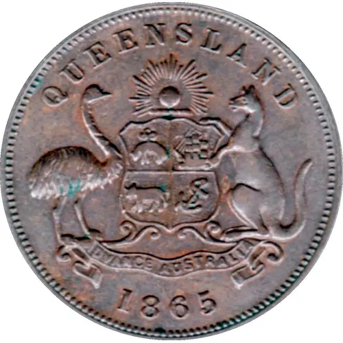 | Описание аверса | Coat of Arms consisting of a central shield below a Rising Sun supported by an emu at left and kangaroo at right all resting on a ribbon with the motto ADVANCE AUSTRALIA. The shield is quartered and contains: upper left - a golden fleece; upper right - a three-masted sailing ship; lower left - a bull standing facing left; lower right a anchor. Above, QUEENSLAND; below, 1865 |