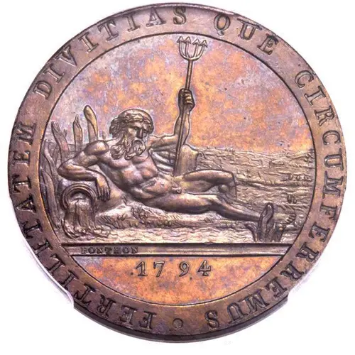 | Opis awersu | River god with trident surrounded by lettering and date below |