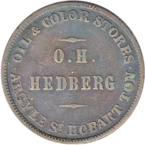 | Obverse lettering | OIL AND COLOR STORES . ARGYLE ST HOBART TON. - O. H. HEDBERG - |