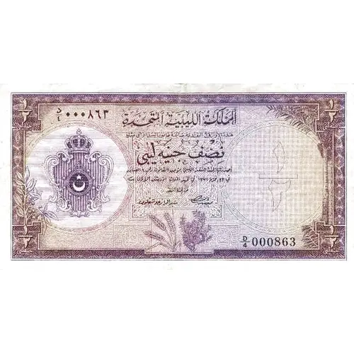 | Obverse lettering | UNITED KINGDOM OF LIBYA THESE CURRENCY NOTES AR LEGAL TENDER FOR THE PAYMENT OF ANY AMOUNT HALF LIBYAN POUND ISSUED BY THE LIBYAN CURRENCY COMMISSION IN ACCORDANCE WITH LAW NO.4 OF 24TH OCTOBER, 1951, IN THE REIGN OF KING IDRIS I. |