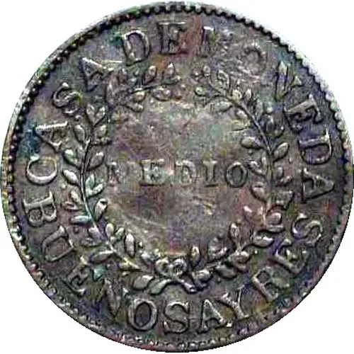 On the perimeter, superior semicircular legend `CASA DE MONEDA` and lower `BUENOS-AYRES`. In the field and within laurel wreaths fruitiness, capes tied with a bow, the legend `MEDIO`. Beading points |
