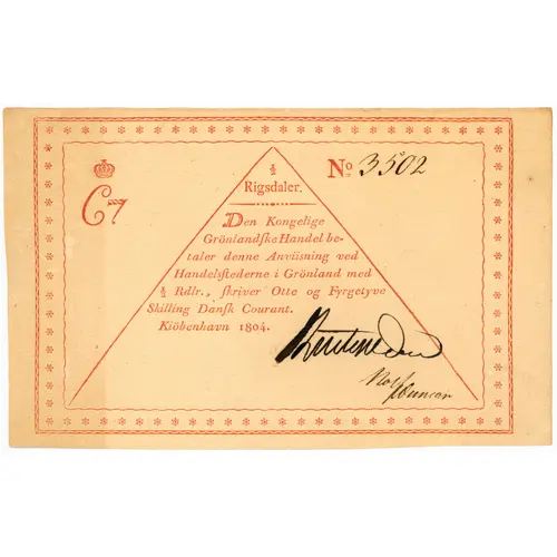 | Legenda do anverso | 1/2 Rigsdaler. Den Kongelige Grönlandſke Handel be- taler denne Anviisning ved Handelsſtederne i Grönland med 1/2 Rdlr., ſkriver Otte og Fyrgetyve Skilling Danſk Courant. Kiöbenhavn 1804. (Translation: 1/2 Rigsdaler. The Royal Greenlandic Trading will pay this note the the trading posts in Greenland with 1/2 Rigsdaler, written 48 Skilling Danish Courant. Copenhagen 1804) |