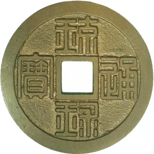 | Description du revers | Two vertical characters divided by hole represent denomination in seal script |