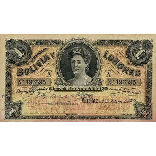 | Chữ khắc mặt trước | EL BANCO DE BOLIVIA Y LONDRES Serie A Pagará al portador UN BOLIVIANO en moneda corriente. La Paz, á 1º de Febrero de 1909. (Translation: The Bank of Bolivia and London Series A Pay to Bearer One Boliviano in currency. La PAz, February 1st., 1909.) |