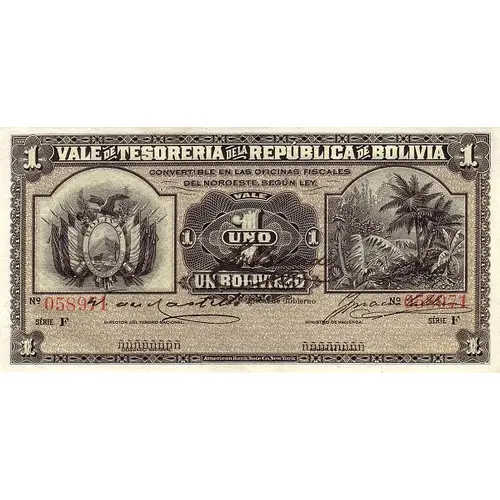 | Legenda awersu | VALE de TESORERIA de la REPÚBLICA de BOLIVIA CONVERTIBLE EN LAS OFICINAS FISCALES DEL NOROESTE, SEGÚN LEY VALE 1 UNO BOLIVIANO Fiscal del Gobierno DIRECTOR DEL TESORO NACIONAL MINISTRO DE HACIENDA DELEGADO NACIONAL ADMOR. DE ADUANAS American Bank Note Co. New York (Translation: Treasury Coupon of the Republic of Bolívia Convertible in the northwest tax offices, according to the law 1 Worth One Boliviano Government Procurator National Treasury Director, Finance Minister, National Delegate, (`Admor.`= `Administrador`) Custom House Administrator American Bank Note Co. New York) |