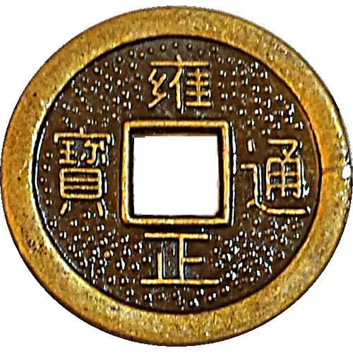 توضیحات روی مدال Chinese ideograms - Top to bottom: 雍正 = Yongzheng, 5th emperor of the Qing dynasty (Manchu) 1723-1735. - Right to left: 通寶 = Tong bao, means currency