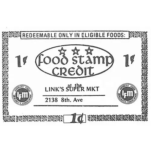 | Vorderseitenlegende | REDEEMABLE ONLY IN ELIGIBLE FOODS: 1₵ food stamp credit 1₵ at the LINK`S SUPER MKT 2138 8th. Ave |