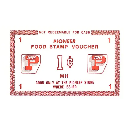 | Leyenda del anverso | NOT REDEEMABLE FOR CASH 1 PIONEER 1 FOOD STAMP VOUCHER 1₵ MH GOOD ONLY AT THE PIONEER STORE 1 WHERE ISSUED 1 |