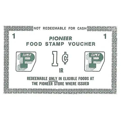 | 正面铭文 | NOT REDEEMABLE FOR CASH 1 PIONEER 1 FOOD STAMP VOUCHER 1₵ IR REDEEMABLE ONLY IN ELIGIBLE FOODS AT THE PIONEER STORE WHERE ISSUED |