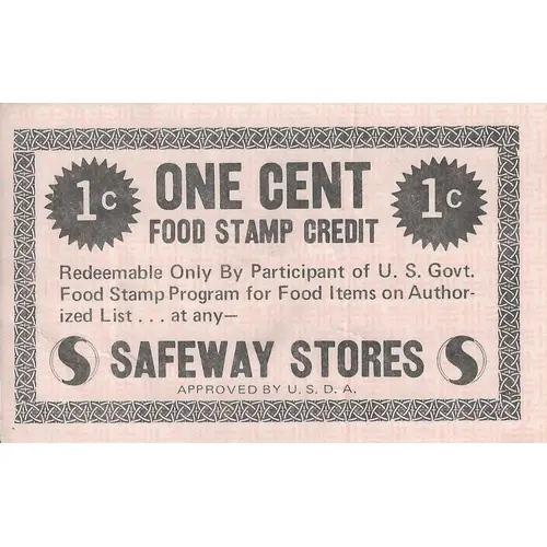 Vorderseitenlegende ONE CENT 1C 1C FOOD STAMP CREDIT Redeemable Only By Participant of U.S. Govt. Food Stamp Program for Food Items on Author- ized List … at any-- SAFEWAY STORES APPROVED BY U.S.D.A.