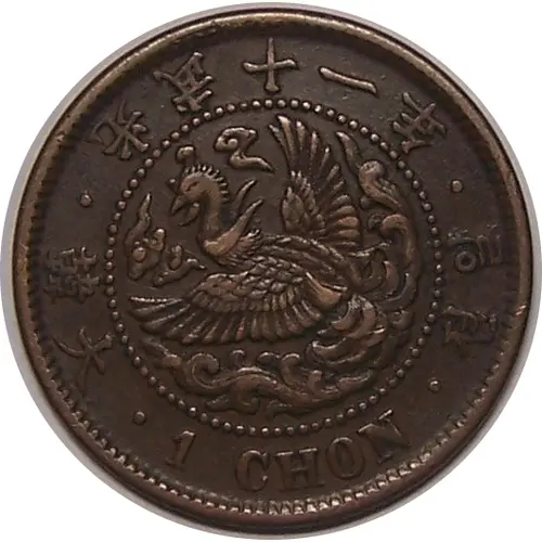 | Obverse lettering | • 大韓 • 光武十一年 • 일젼 • 1 CHON (Translation: Great Korea, 11th year of Gwang Mu, One Jeon) |