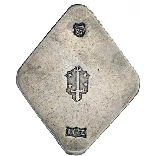 | Description de l’avers | Three counterstamps on the long axis: at center city arms (sword, cross and stars); crescent and star (top), date (bottom). |