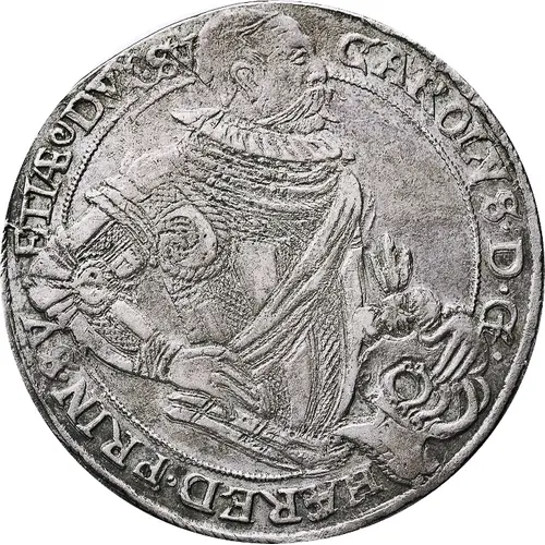 | Beschrijving voorzijde | Half-figure of Duke Karl in full ornate armor with a diagonal folded band. Left hand is upon an helmet ornate with long feathers, while the right is on side. Lettering around rim. |
