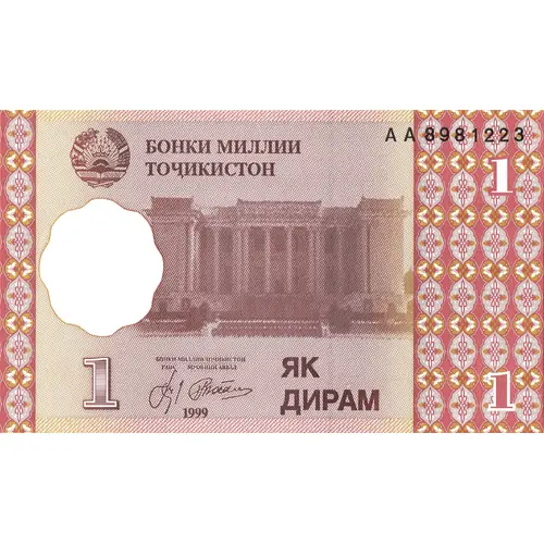 | Obverse lettering | БОНКИ МИЛЛИИ ТОҶИКИСТОН ЯК ДИРАМ (Translation: National Bank of Tajikistan, One Diram) |