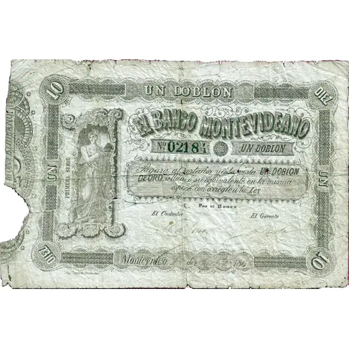 | Chữ khắc mặt trước | UN DOBLON EL BANCO MONTEVIDEANO Nº 028184 UN DOBLON PRIMERA SERIE Pagará al portador y a la vista UN DOBLON DE ORO sellado ó su equivalente en la misma especie con arreglo a la Ley Por el Banco El Contador El Gerente Montevideo, 1 de Agosto de 1865 Litogr. Wiegeland Montevideo (Translation: One Doblón The Montevidean Bank Nº 028184 One Doblón First Series Will pay to the bearer and at sight One sealed Golden Doblón or its equivalent in the same species accordingly to the Law By the Bank The Accountant the Manager Montevideo, august 1st., 1865) |