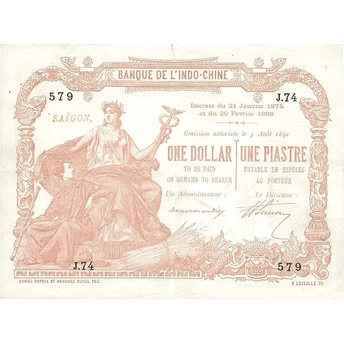 BANQUE DE L`INDO-CHINE SAïGON DÉCRETS DU 21 JANVIER 1875 ET DU FÉVRIER 1888 EMISSION AUTORISÉE LE 3 AOÛT 1891 ONE DOLLAR TO BE PAID ON DEMAND TO BEARER UN ADMINISTRATEUR : UNE PIASTRE PAYABLE EN ESPÈCES AU PORTER LE DIRECTEUR : DANIEL DEPUIS ET GEORGES DUVAL FEC. LEVEILLE SC |