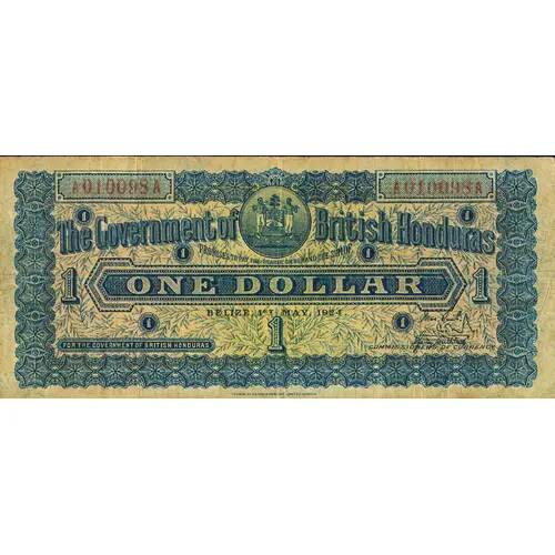 Blue print; red serial numbers. Coat of arms of British Honduras at top. |