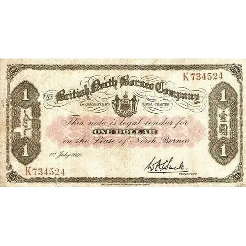 | Ön yüz lejandı | The British North Borneo Company This note is legal tender for ONE DOLLAR in the State of North Borneo |