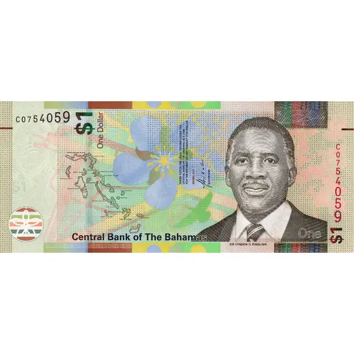 Multicolour print and underprint. Black and red ascending serial numbers. Front-facing bust of Sir Lynden O. Pindling at right, lignum vitae flower (Guaiacum sp.) at centre, map of the Bahamas at centre-left. See-through feature at lower left. |