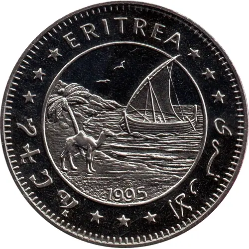 | Obverse description | Palm, camel and a dhow on the sea, in circle. Legend in Tigrinya, English and Arabic around the toothed rim. |
