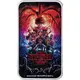 The iconic Season 2 poster with the main characters, with a focus on Eleven, in a dramatic moment as she unleashes her supernatural powers. The background portrays the eerie Upside Down world with the Mind Flayer’s silhouette dominating the stormy sky above and a haunting pumpkin patch below |