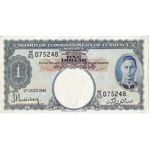 BOARD OF COMMISSIONERS OF CURRENCY MALAYA THIS NOTE IS LEGAL TENDER FOR ONE DOLLAR IN THE STRAITS SETTLEMENTS AND MALAY STATES 1 1st JULY 1941 [signature] [serial no] CHAIRMAN OF THE COMMISSIONERS WATERLOW & SONS LIMITED, LONDON |