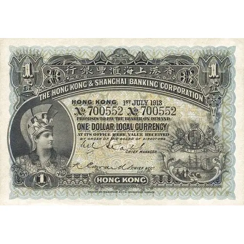 | Leyenda del anverso | THE HONG KONG & SHANGHAI BANKING CORPORATION HONG KONG, 1st June, [YEAR]. PROMISES TO PAY THE BEARER ON DEMAND ONE DOLLAR LOCAL CURRENCY AT ITS OFFICE HERE, VALUE RECEIVED. BY ORDER OF THE BOARD OF DIRECTORS CHIEF MANAGER CHIEF ACCT HONG KONG 壹 BRADBURY, WILKINSON & CO LD ENGRAVERS |