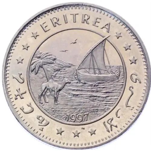 | Descrizione del dritto | Palm, camel and a dhow on the sea, in circle. Legend in Tigrinya, English and Arabic around the toothed rim. |
