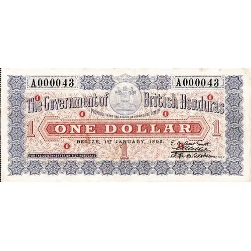 The Government of British Honduras PROMISE TO PAY THE BEARER ON DEMAND THE SUM OF ONE DOLLAR BELIZE, 1st JANUARY, 1895 FOR THE GOVERNMENT OF BRITISH HONDURAS COMMISSIONERS OF CURRENCY 1 |