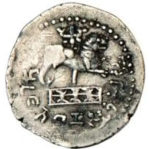 | 正面描述 | An elephant`s head with a lion`s forepart above above an ornamental railing, all with Brahmi legend read counter-clockwise obelow. |
