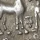 A deer standing to the right with a square-shaped vase above its back, an early Srivatsa symbol between its horns, Indradhaja between deer and godess Lakshmi, the goddess Lakshmi stands on the right field in front of the deer, facing forward, and holds a lotus flower with an upraised right hand, the Brahmi legend around the field, |