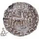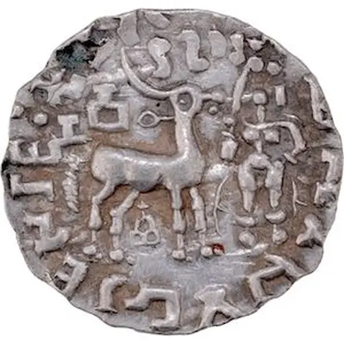 A deer standing to the right with a square-shaped vase above its back, an early Srivatsa symbol between its horns, three-arched hill (chaitya) with parasol below the deer, the goddess Lakshmi stands on the right field in front of the deer, facing forward, and holds a lotus flower with an upraised right hand, the Brahmi legend around the field, |