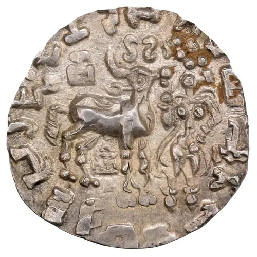 A centrally placed six-arched hill (chaitya) with parasol, a wavy river line below and a Nandipada (Triratna) above, Swastika above Indradhvaja on the left field and a tree within railings on the right, the Kharoshthi legend around the field |