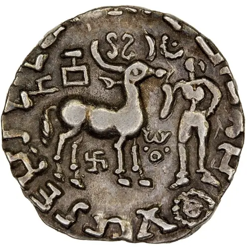 | Obverse description | Deer & Lakshmi holding lotus & standing on parasol, srivatsa & vase, swastika below the deer, nandipada between the deer & Lakshmi, legend around (`Rajnah Kunindasya Amoghabhutisya maharajasya`). |