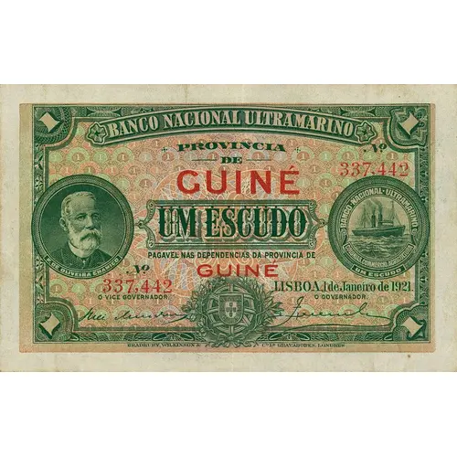 | Opschrift voorzijde | BANCO NACIONAL ULTRAMARINO PROVINCIA DE GUINÉ UM ESCUDO PAGAVEL NAS DEPENDENCIAS DA PROVINCIA DE GUINÉ LISBOA, 1 de Janeiro de 1921. BRADBURY, WILKINSON & & Co. Ld. GRAVADORES, LONDRES (Translation: National Bank Overseas Province of Guinea One Escudo Payable at the premises of the Province of Guinea Lisbon, January 1st, 1921. Bradbury, Wilkinson & Co. Ltd. Engravers, London) |