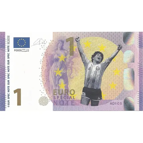 | Arka yüz açıklaması | Diego Maradona back with soccer ball, Argentine sun. Dove profile with spread wings and European Union map background. |