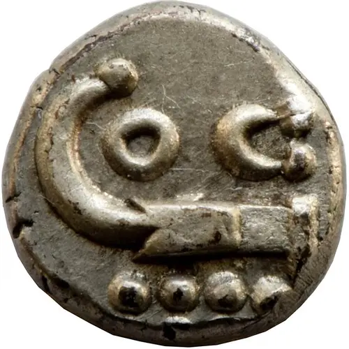 | توضیحات روی سکه | Lazy J (stylized boar?) below O C above three rows of four dots. |