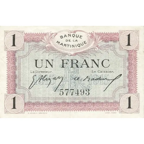 | Obverse lettering | BANQUE DE LA MATINIQUE 1915 // UN FRANC // 1915 B.ARNAUD . GRAV. LYON_PARIS (Translation: Bank of Martinique One Franc 1915) |