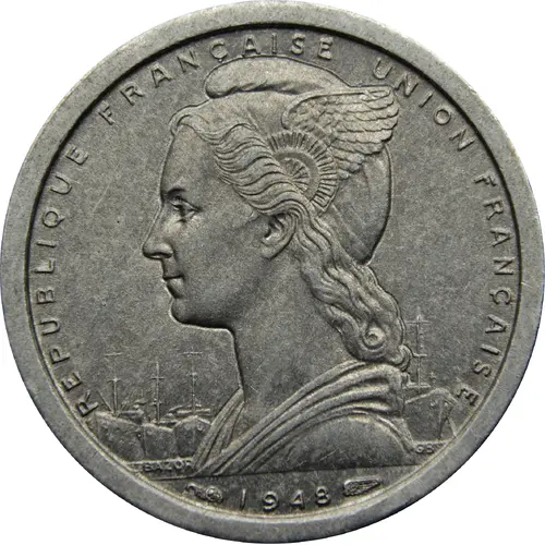 | Obverse lettering | RÉPUBLIQUE FRANÇAISE UNION FRANÇAISE L BAZOR GB 1948 (Translation: French Republic, French Union.) |