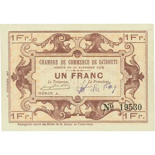 | نوشتههای روی اسکناس | CHAMBRE DE COMMERCE DE DJIBOUTI ARRÈTÉ DU 30 NOVEMBRE 1919 UN FRANC Le Trésorier Le Président Echangeable contre des Billetes de la Banque de l`Indo-Chine 1 Fr. A. DESVAGES IMP (Translation: Chambre of Commerce of Djibouti. Order of November 30, 1919. One franc. The treasurer, the president. Exchangeable for Bank of Indochina banknotes.) |