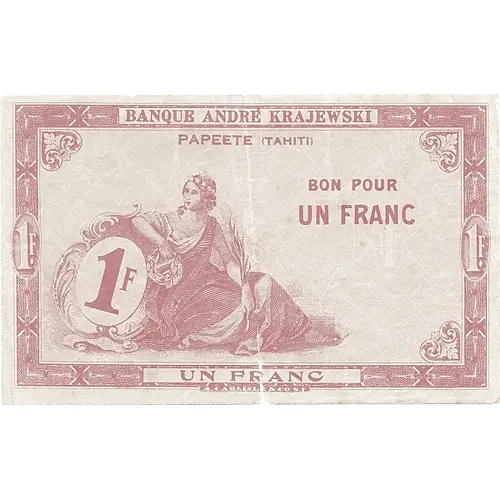| Opschrift voorzijde | BANQUE ANDRÉ KRAJEWSKI PAPEETE (TAHITI) BON POUR UN FRANC 1F UN FRANC A. CARLISLE & CO. S.F. (Translation: André Krajewski Bank Papeete (Tahiti) good for One Franc A. Carlisle & Co. S.F.) |