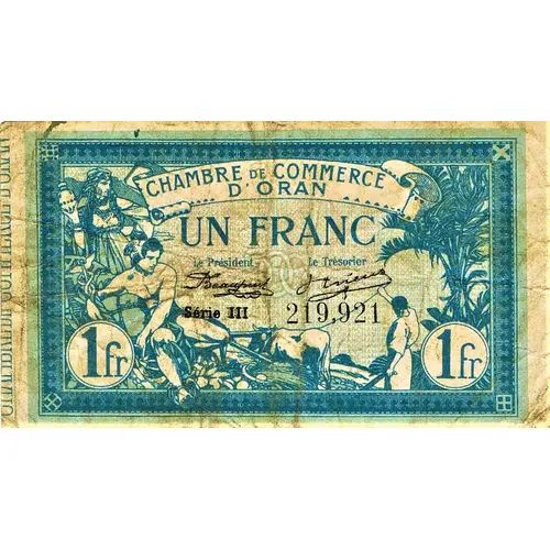 | 正面铭文 | CHAMBRE DE COMMERCE D`ORAN UN FRANC Le Président Le Trésorier Série III 219,921 |