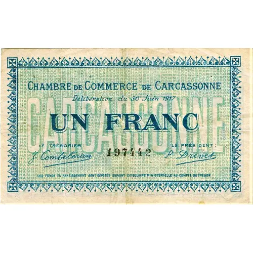 | Opschrift voorzijde | CHAMBRE DE COMMERCE DE CARCASSONNE Délibération du 30 juin 1917 UN FRANC Le Trésorier 197442 Le Président Les fonds en nantissement sont déposés suivant circulaire ministérielle au compte du Trésor. |
