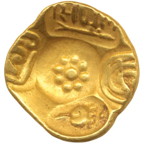| Aversbeschreibung | Punch-marked type, with five punches on obv., 1 punch of a lotus in centre, 2 punches of Kannada letter ’Shri’, 1 punch of Shankha or Conch shell and 1 punch of Devnagari legend ’Sri Simghana’ with a javelin below |