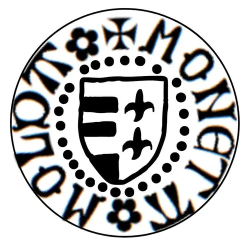 正面描述 Coat of arms, a split shield, left three bars; right 2 lilies.