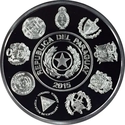 | توضیحات روی سکه | Paraguay coat of arms at center with legend at top and date at bottom. Surrounded with all arms from countries that minted coins for this 10th series. |